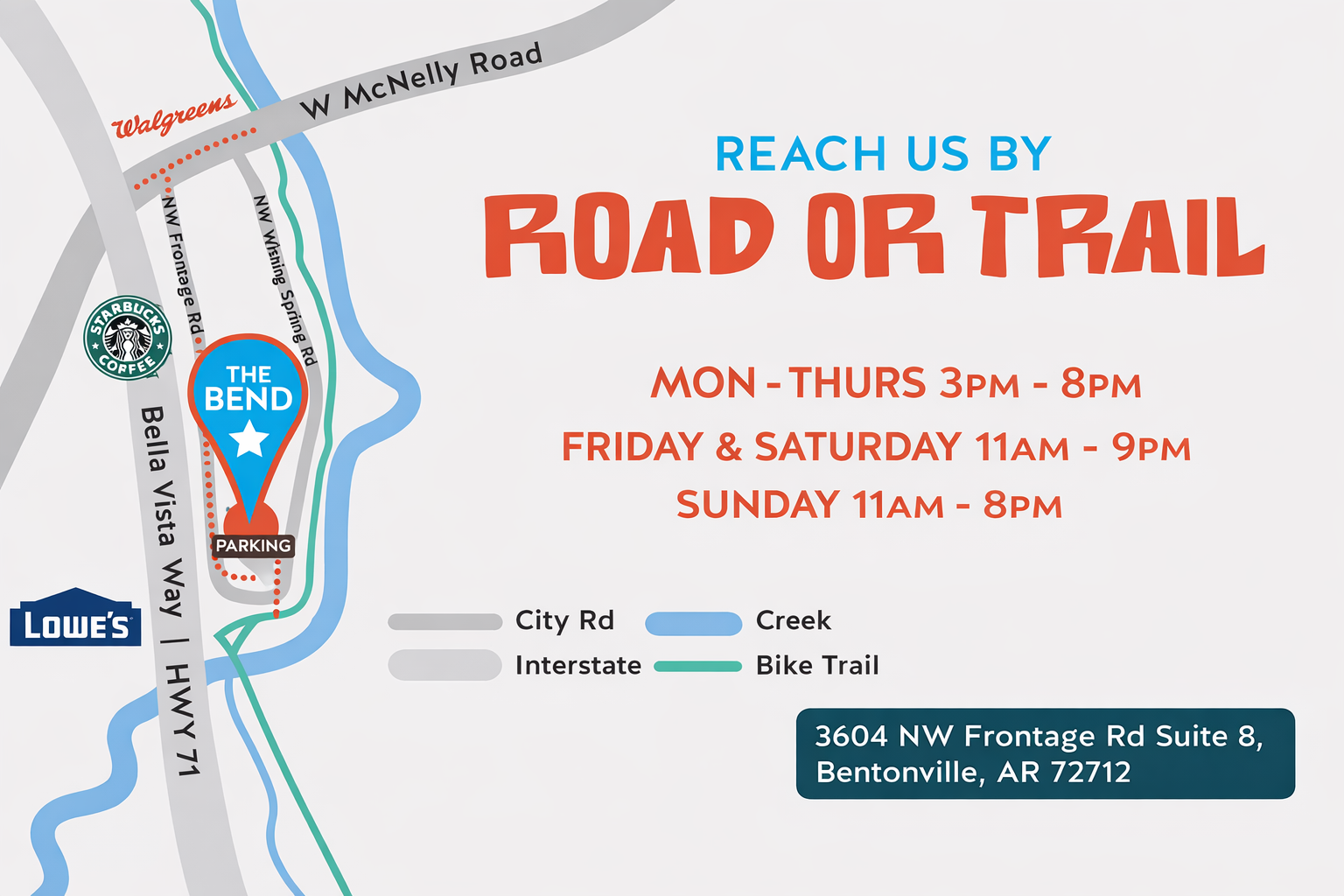 The Bend is Bentonville’s go-to trailside hangout and the best place to host your outdoor party. With plenty of space, family-friendly games, and a dog-friendly vibe, your guests will feel right at home. Whether it’s a birthday, team gathering, or just a reason to celebrate, we’ll provide the fun atmosphere, refreshing drinks, and trailside energy that make every event unforgettable.